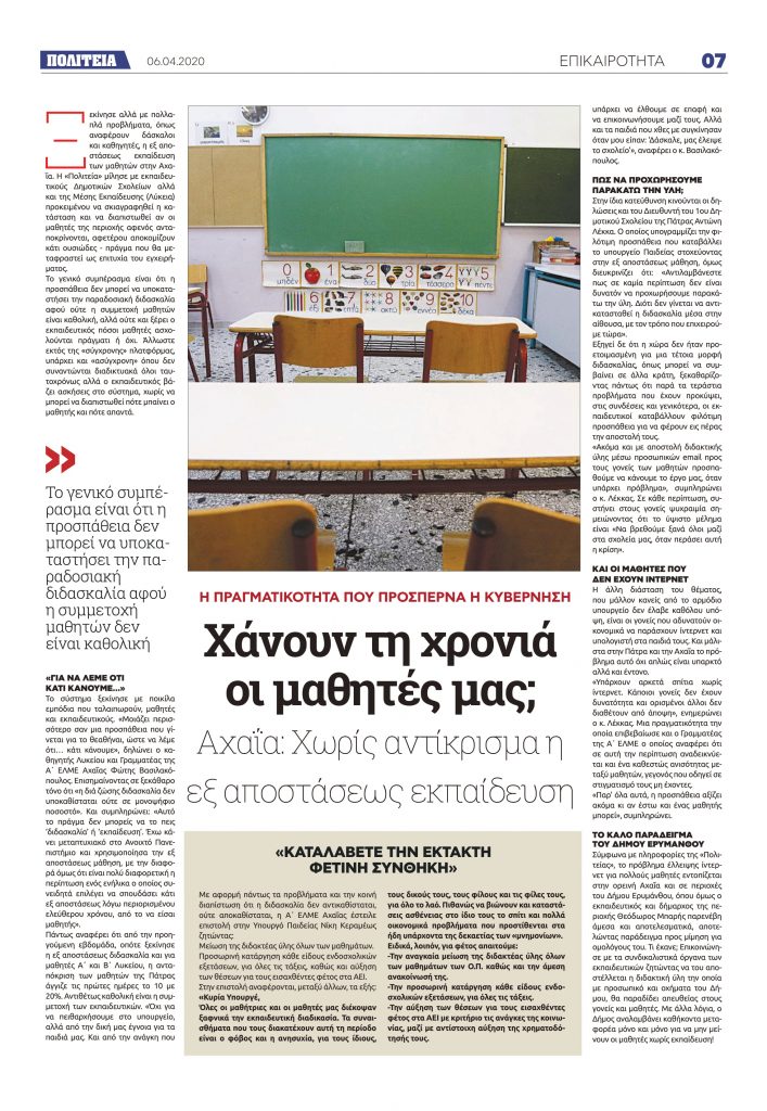 Στην ίδια κατεύθυνση κινούνται οι δηλώσεις και του Διευθυντή του 1ου Δημοτικού Σχολείου της Πάτρας Αντώνη Λέκκα. Ο οποίος υπογραμμίζει την φιλότιμη προσπάθεια που καταβάλλει το υπουργείο Παιδείας στοχεύοντας στην εξ αποστάσεως μάθηση, όμως διευκρινίζει ότι: «Αντιλαμβάνεστε πως σε καμία περίπτωση δεν είναι δυνατόν να προχωρήσουμε παρακάτω την ύλη. Διότι δεν γίνεται να αντικατασταθεί η διδασκαλία μέσα στην αίθουσα, με τον τρόπο που επιχειρούμε τώρα».