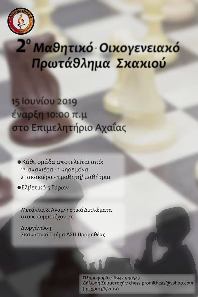 Για 2η συνεχόμενη χρονιά θα διεξαχθεί στην περιοχή μας το Μαθητικό – Οικογενειακό Πρωτάθλημα Σκακιού. Πρόκειται για μία Γιορτή του Σκακιού, μία φιλόδοξη ιδέα, που δίδει τη δυνατότητα σε γονείς/κηδεμόνες και παιδιά να δημιουργήσουν τη δική τους Ομάδα και να απολαύσουν παίζοντας το πιο όμορφο πνευματικό παιχνίδι.