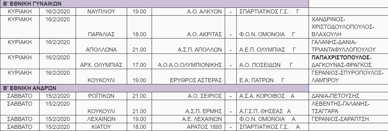 Όσον αφορά, τη Β’ Εθνική Ανδρών, έχουμε ντέρμπι για την 15η αγωνιστική ανάμεσα σε Ερμή και Θησέα, με τους φιλοξενούμενους του Άρη Αγγελόπουλου να έρχονται με ανεβασμένη ψυχολογία μετά τη νίκη-πρόκριση στον τελικό του Κυπέλλου Πελοποννήσου. Παρόλα αυτά, οι γηπεδούχοι έχουν δείξει πως ειδικότερα στην έδρα τους μπορούν τα πάντα! Η αναμέτρηση έχει προγραμματιστεί για τις 15/2 και ώρα 21.00, ενώ ο Άθλος του Δημήτρη Σπυρόπουλου έχει ρεπό.