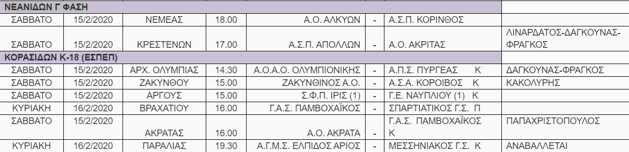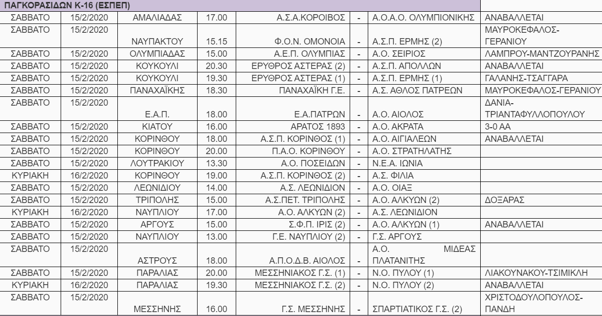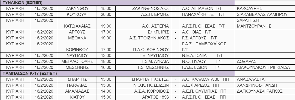 Ο Αιγιαλέων αντιμετωπίζει στις 15.00 εκτός έδρας τον Ζακυνθινό, ενώ τα Αστέρα Αχαΐας την ίδια μέρα μετά από λίγες ώρες (19.30) υποδέχονται τον Θησέα. Όπως κάθε Σ/Κ, μεγάλο ενδιαφέρον συγκεντρώνουν οι αναμετρήσεις σε Παγκορασίδες και Κορασίδες, ενώ για την Γ’ Φάση Νεανίδων ο Απόλλωνας κοντράρεται με τον Ακρίτα στις 17.00.
