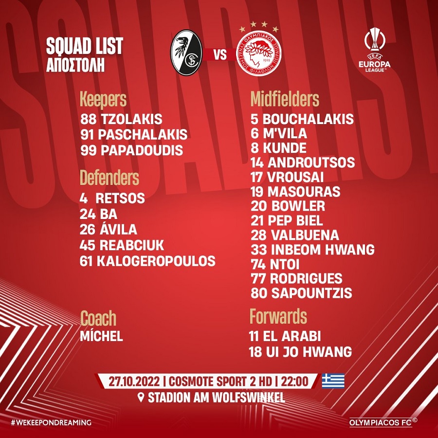 Με συγκομιδή μόλις ενός βαθμού στα πρώτα τέσσερα παιχνίδια του γκρουπ, οι «ερυθρόλευκοι» αναζητούν ένα… υπερβατικό «διπλό» στο «Europa-Park Stadion», απέναντι σε μία απ’ τις καλύτερες ομάδες της εφετινής Bundesliga, για να διατηρηθούν σε θέση ικανή για να απειλήσουν τη Ναντ, ενόψει της δικής τους (τελικής) αναμέτρησης στο «Γ. Καραϊσκάκης» την επόμενη Πέμπτη (3/11).