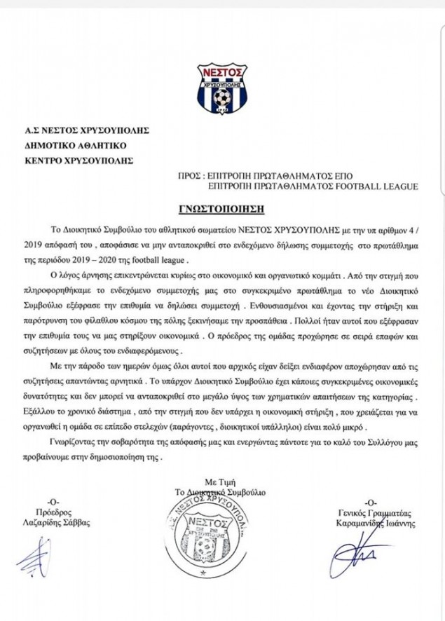 Η διοίκηση του Νέστου Χρυσούπολης γνωστοποίησε την απόφαση της στην ΕΠΟ να μην συμμετάσχει στο νέο πρωτάθλημα της Football League, λόγω του υψηλού κόστους συμμετοχής.
