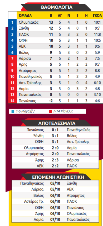 ΣΑΒΒΑΤΟ 13/9 18:00 Ολυμπιακός-Πανσερραϊκός Στάδιο "Γ. Καραϊσκάκης" 20:00 Παναιτωλικός-Βόλος Γηπ. Παναιτωλικού 20:00 Ατρόμητος-Αρης Δημ. Στάδιο Περιστερίου