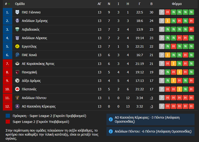Έτσι, λοιπόν η 2η θέση που θα οδηγήσει στο μπαράζ της Superleague 1, «παίζεται» ακόμα καθώς ο Απόλλων Λάρισας μείωσε στο -1 μετά την πειστική του εμφάνιση και νίκη με 2-0 κόντρα στην Α.Ε. Καραϊσκάκης (που συνεχίζει να κατρακυλά), ενώ δεν πρέπει να ξεχνάμε και τις υπόλοιπες ομάδες που… ανηφορίζουν επικίνδυνα.