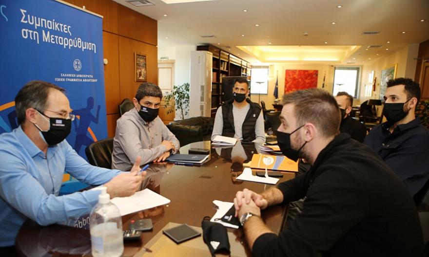 Σε πολύ καλό κλίμα πραγματοποιήθηκε νωρίς το μεσημέρι η συνάντηση μεταξύ των Υφυπουργού Αθλητισμού Λευτέρη Αυγενάκη και Γενικού Γραμματέα Αθλητισμού Γιώργου Μαυρωτά, με αντιπροσωπεία του Πανελλήνιου Συνδέσμου Αμειβομένων Καλαθοσφαιριστών.