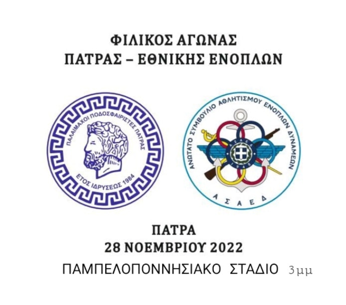 Η μικτή ποδοσφαιρική ομάδα του Συνδέσμου Παλαιμάχων Πάτρας θα αντιμετωπίσει την Εθνική ομάδα Ενόπλων Δυνάμεων σήμερα (27/11, 15.00) στο Παμπελοποννησιακό Στάδιο.
