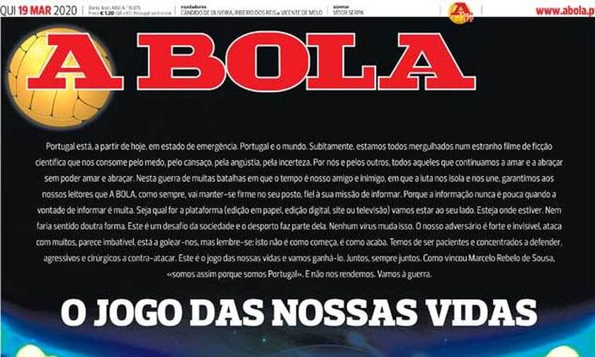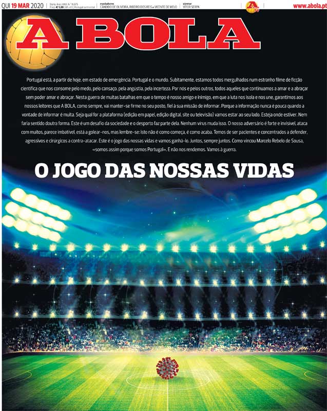 Σε αυτό το κλίμα, κυκλοφόρησε την Πέμπτη (19/3) η αθλητική εφημερίδα A Bola, με ενωτικό τίτλο στο πρωτοσέλιδο της: «Το παιχνίδι της ζωή μας».