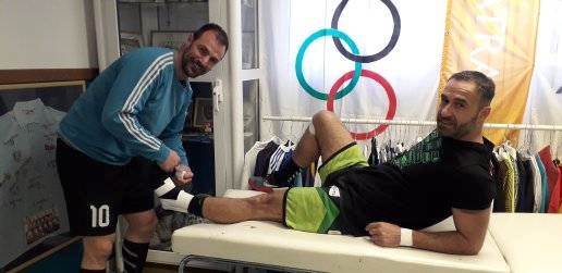 Η φωτογραφία είναι τραβηγμένη πριν την έναρξη του αγώνα της Α2 εθνικής κατηγορίας ανδρών χάντμπολ στην Πάτρα μεταξύ των ομάδων Ακαδημίας των Σπορ – Ο.Φ. Νέας Ιωνίας το Σαββάτο 29/2/20 και διακρίνονται ο αθλητής της φιλοξενούμενης ομάδος Ο.Φ. Νέας Ιωνίας Εριόν Γκουλέ (φυσικοθεραπευτής στο επάγγελμα) να δένει τον αστράγαλο του αντίπαλου αθλητή των γηπεδούχων, τον διεθνή με την εθνική ανδρών beach handball της Α.Ε. Πάτρας Ακαδημίας των Σπορ, Κανέλλο Γεωργίου.