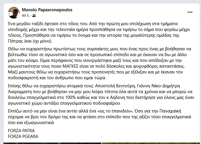 «Ένα μεγάλο ταξίδι έφτασε στο τέλος του. Από την πρώτη μου στελέχωση στα τμήματα υποδομής μέχρι και την τελευταία ημέρα προσπάθησα να τιμήσω το σήμα που φοράω μέχρι τέλους. Προσπάθησα να τιμήσω το όνομα και την ιστορία της μεγαλύτερης ομάδας της Πάτρας (και όχι μόνο).