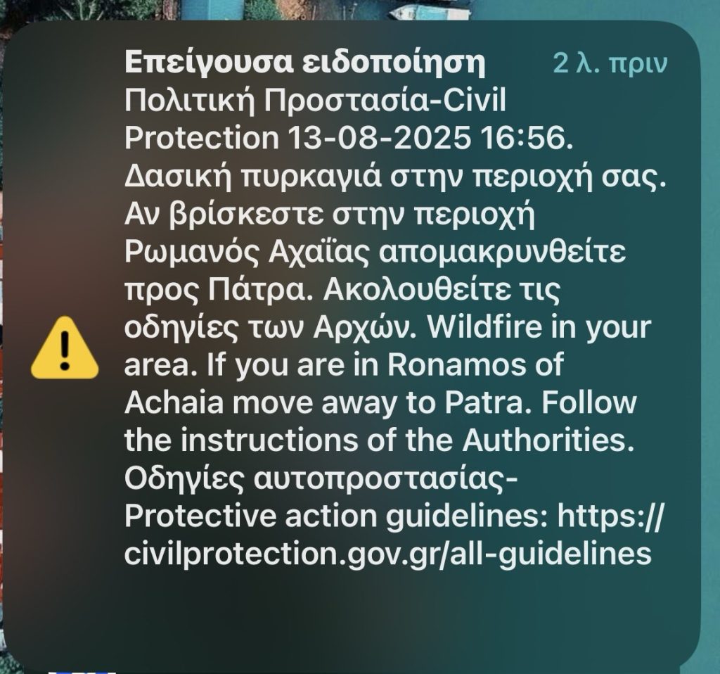Εκδόθηκε πριν από λίγο σήμα 112 για εκκένωση της περιοχής Ρωμανού της Πάτρας.