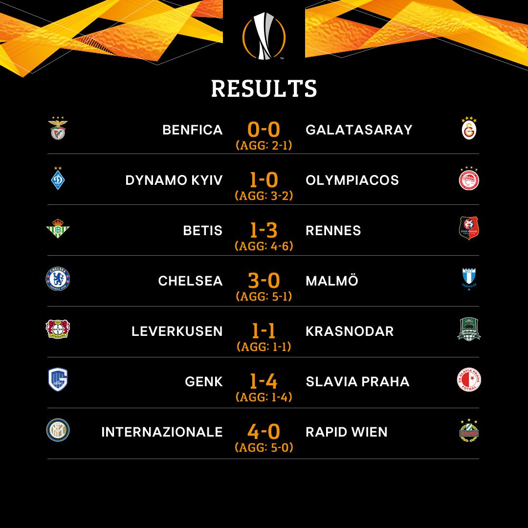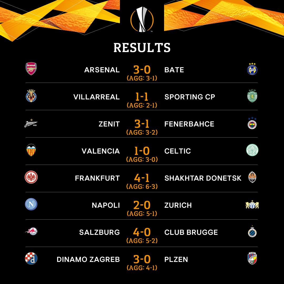 Προκρίνονται οι: Ντιναμό, Σάλτσμπουργκ, Νάπολι, Άιντραχτ Φρανκφούρτης, Βαλένθια, Ζενίτ, Βιγιαρέλ και Άρσεναλ