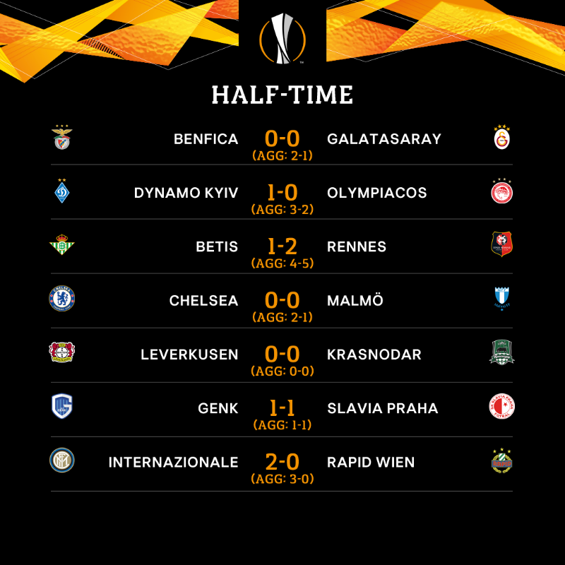 Η Ντιναμό έχει ανοίξει το σκορ στον Ολυμπιακό, ενώ Ρεν και Ίντερ προηγούνται με 2-0 των Μπέτις και Ραπίντ.