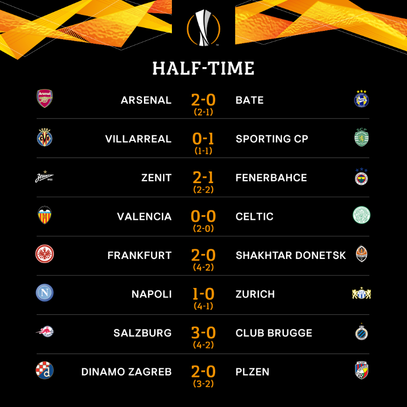 Το σκορ έχει ανοίξει στα ματς Άρσεναλ-ΜΠΑΤΕ Μπόρισοβ 1-0 (4′ Βολκόφ αυτογκόλ), και Ζενίτ-Φενερμπαχτσέ 1-0 (4′ Οζντόεφ).