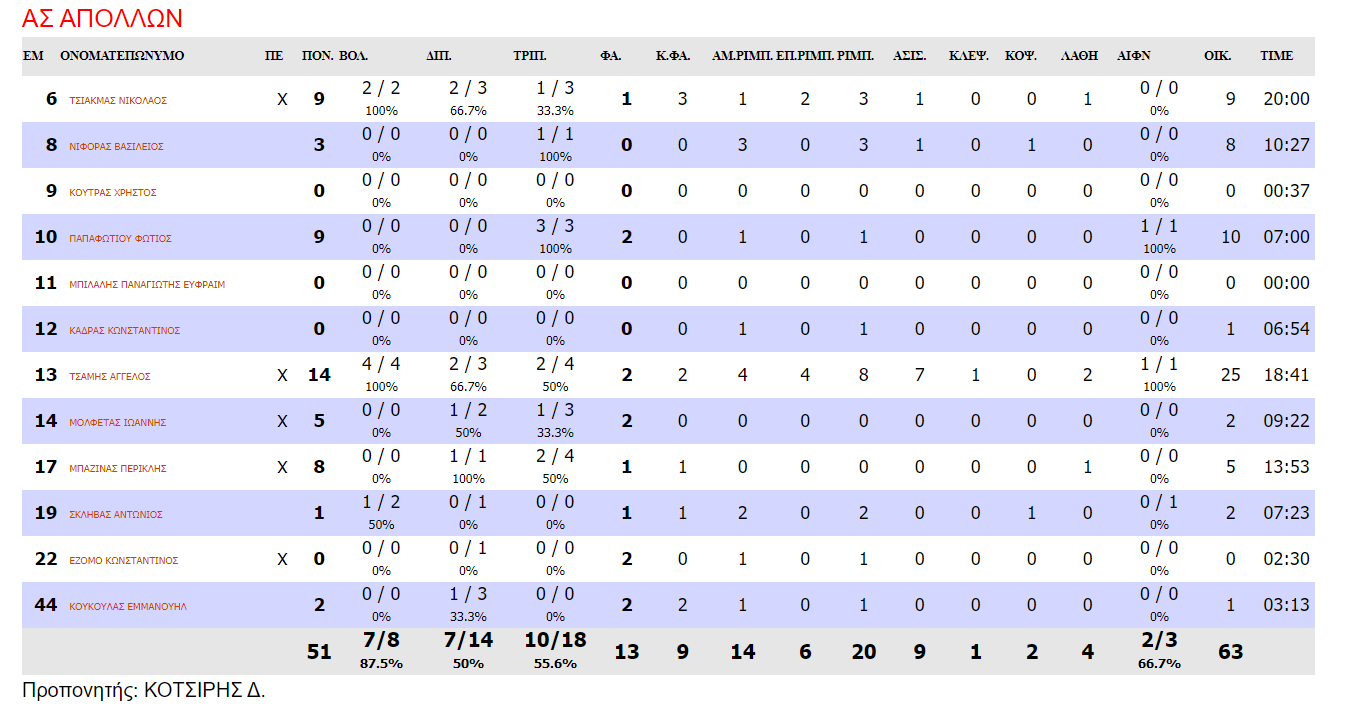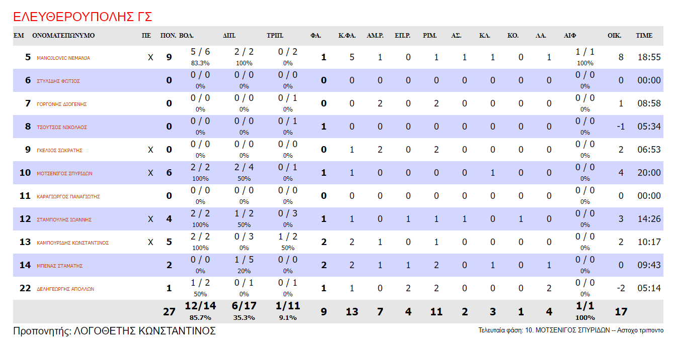 Πρώτος σκόρερ για την ομάδα του Δελέγκου, ο Άγγελος Τσάμης με 14 πόντους, ενώ ακολουθούν οι Τσιακμάς και Παπαφωτίου με 9 πόντους και Μπαζίνας με 8.