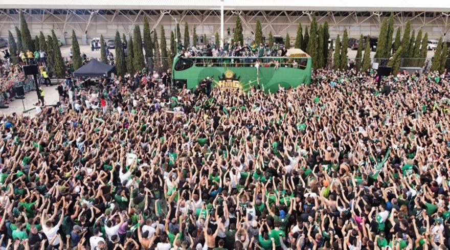 Όπως είναι λογικό, η κατάσταση αυτή δημιούργησε μεγάλη καθυστέρηση, με τον κόσμο να αυξάνεται διαρκώς στο ΟΑΚΑ και να αναμένει την άφιξη του πούλμαν, δημιουργώντας καταπληκτική ατμόσφαιρα με συνθήματα και μπόλικο τραγούδι. Η ΚΑΕ Παναθηναϊκός AKTOR είχε δημιουργήσει έναν ειδικό περιφραγμένο χώρο, μπροστά από τον οποίο θα μπορούσε να περάσει με ασφάλεια η αποστολή, έτσι ώστε να αποθεωθεί.
